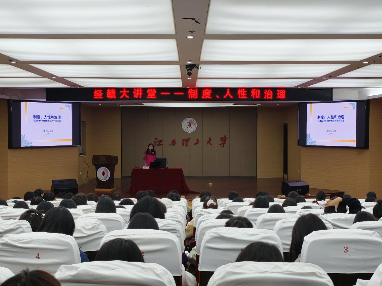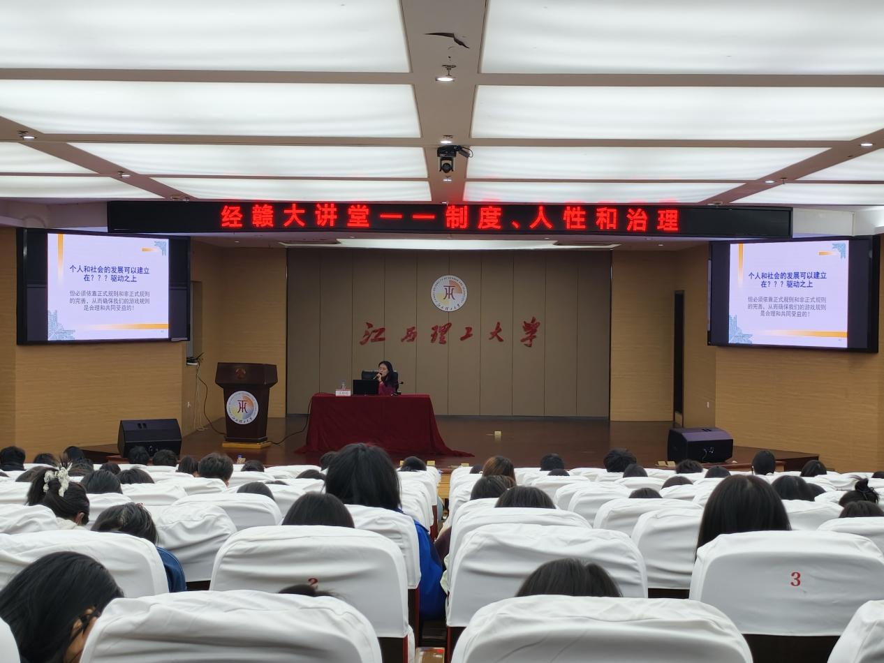 本网讯 为进一步提升我院师生在制度经济学领域的学术素养与研究水平,我院“经赣大讲堂”第十七期于11月27日晚在红旗校区图书馆报告厅举行。本次讲座以“制度、人性和治理”为主题,特邀云南财经大学王玲玲研究员主讲,我院共150余名师生参加,讲座由学院董娟博士主持。