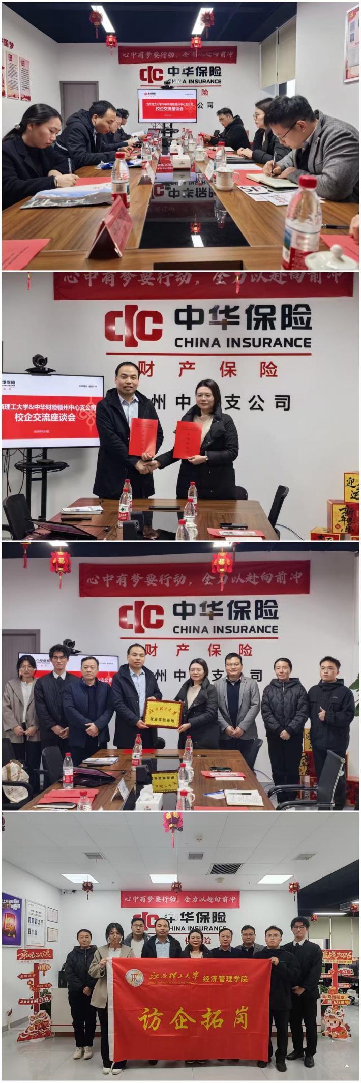 本网讯 为深化校企协同育人机制,拓宽毕业生高质量就业通道,1月8日,由我院党委副书记吴媛带队,招生就业处郭传州、辅导员薛飞、周晓晶及2022、2023级学生代表一行,前往中华财险财产保险赣州中心支行开展“访企拓岗”专项走访活动。
