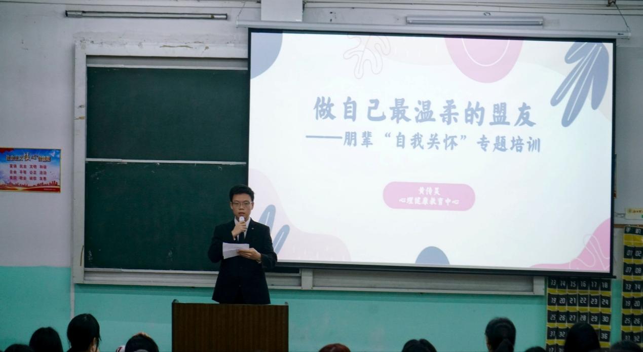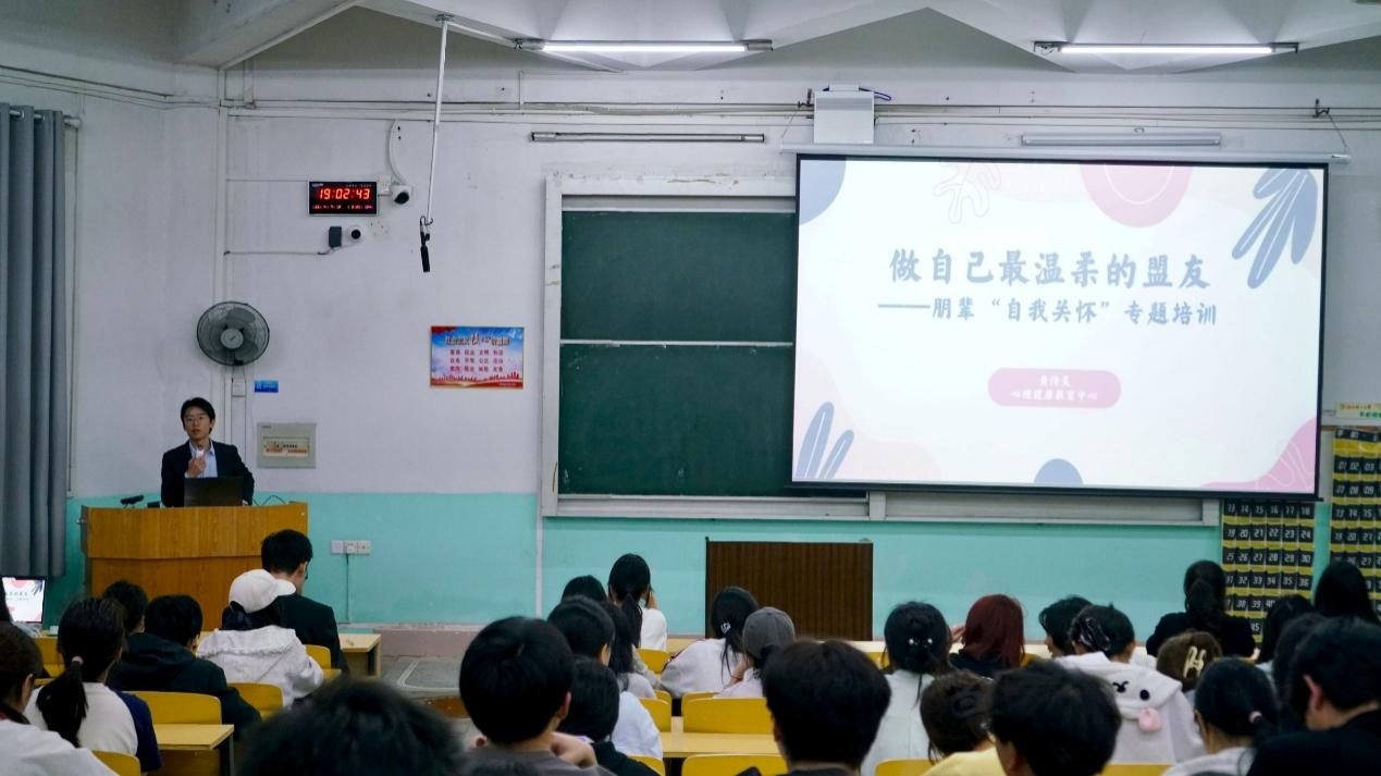本网讯 为加强学院心理健康教育队伍建设,搭建宿舍心理关怀平台,4月7日,我院于红旗校区主教D01教室举办做自己最温柔的盟友——朋辈“自我关怀”专题培训。本次专题培训由心理健康教育中心黄传昊老师主讲,我院各班级心理委员、宿舍心理联络员参加。