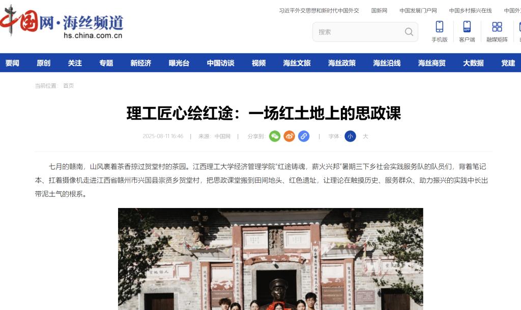 七月的赣南,山风裹着茶香掠过贺堂村的茶园。江西理工大学经济管理学院“红途铸魂,薪火兴邦”暑期三下乡社会实践服务队的队员们,背着笔记本、扛着摄像机走进江西省赣州市兴国县崇贤乡贺堂村,把思政课堂搬到田间地头、红色遗址,让理论在触摸历史、服务群众、助力振兴的实践中长出带泥土气的根系。