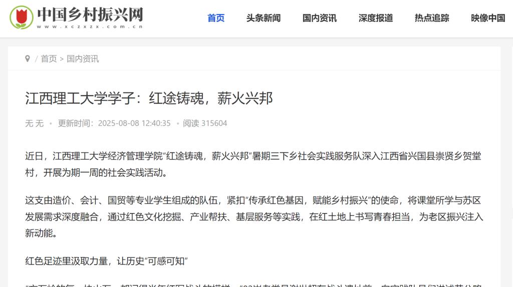 近日,江西理工大学经济管理学院“红途铸魂,薪火兴邦”暑期三下乡社会实践服务队深入江西省兴国县崇贤乡贺堂村,开展为期一周的社会实践活动。