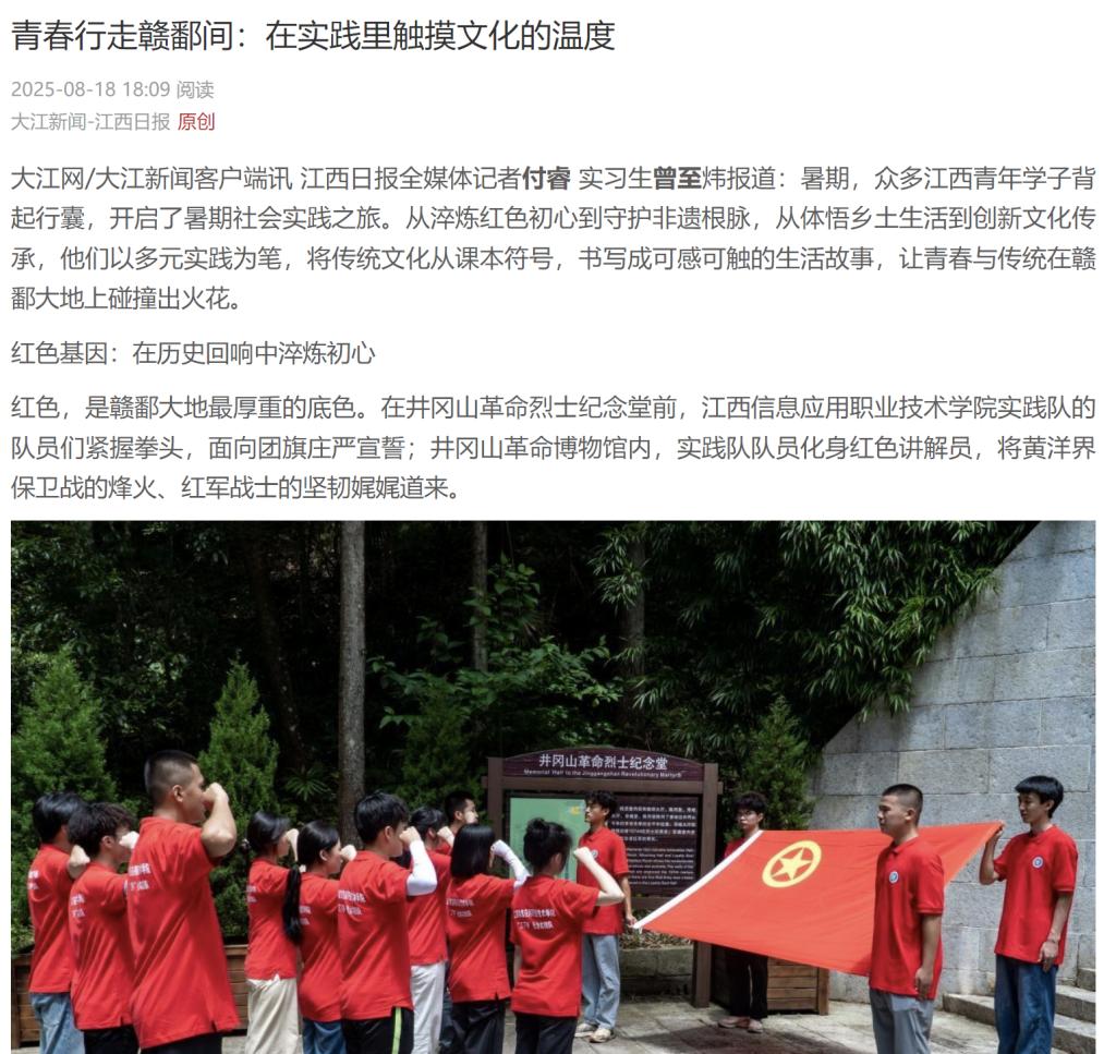 红色,是赣鄱大地最厚重的底色。在井冈山革命烈士纪念堂前,江西信息应用职业技术学院实践队的队员们紧握拳头,面向团旗庄严宣誓;井冈山革命博物馆内,实践队队员化身红色讲解员,将黄洋界保卫战的烽火、红军战士的坚韧娓娓道来。