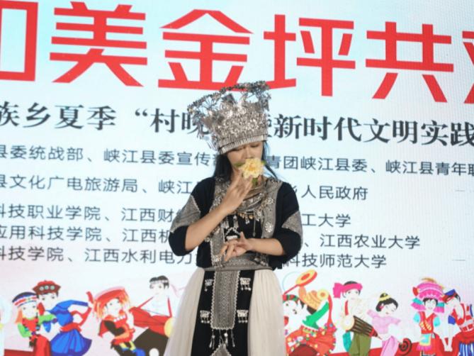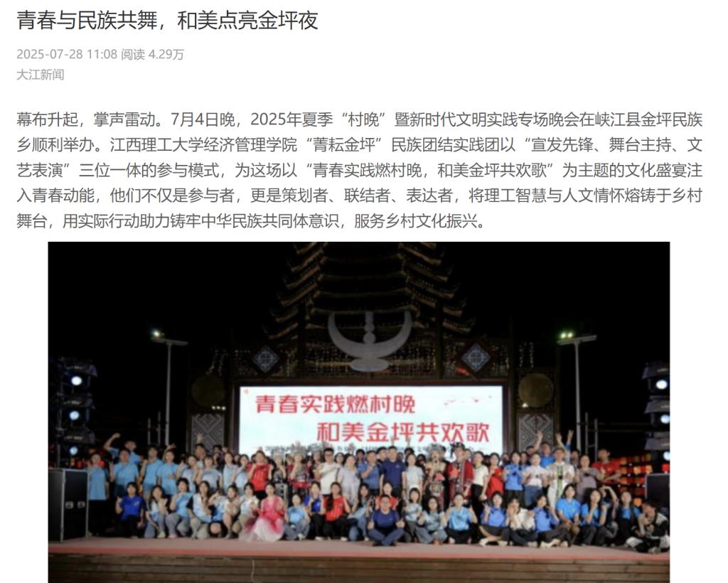 幕布升起,掌声雷动。7月4日晚,2025年夏季“村晚”暨新时代文明实践专场晚会在峡江县金坪民族乡顺利举办。江西理工大学经济管理学院“菁耘金坪”民族团结实践团以“宣发先锋、舞台主持、文艺表演”三位一体的参与模式,为这场以“青春实践燃村晚,和美金坪共欢歌”为主题的文化盛宴注入青春动能,他们不仅是参与者,更是策划者、联结者、表达者,将理工智慧与人文情怀熔铸于乡村舞台,用实际行动助力铸牢中华民族共同体意识,服务乡村文化振兴。