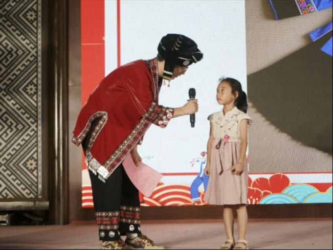舞台中央,实践队员作为主持人之一,以沉稳亲和的风格串联全场。主持中,他既用标准的语言清晰报幕,保障节目衔接流畅;又适时融入对民族文化的解读,比如介绍竹竿舞的寓意、民族服饰的内涵等,让观众更易理解节目背后的文化底蕴。在互动环节,他巧妙引导观众参与“民族服饰猜猜”小游戏,现场气氛热烈,小朋友跃跃欲试,村民们笑声阵阵,高校学子也频频点头。