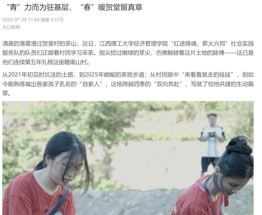 暮色中的贺堂村,村史馆的灯光与茶山的萤火虫交相辉映。墙上,《贺堂村志》的续写本里,新添了一页:“2025年夏,江西理工大学的孩子们又来了,他们教我们使用智能手机,我们教他们采茶,就像一家人……”这不是结束,而是新的开始。当青春的脚步与乡村的心跳同频,当高校的智慧与土地的期盼共振,这场“双向奔赴”必将在赣南红土地上,生长出更多希望与力量。