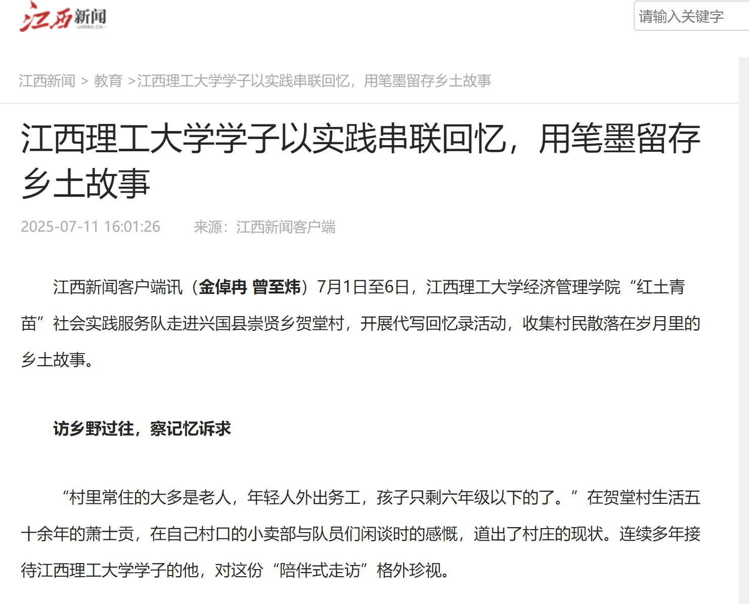 江西新闻客户端讯(金倬冉 曾至炜)7月1日至6日,江西理工大学经济管理学院“红土青苗”社会实践服务队走进兴国县崇贤乡贺堂村,开展代写回忆录活动,收集村民散落在岁月里的乡土故事。