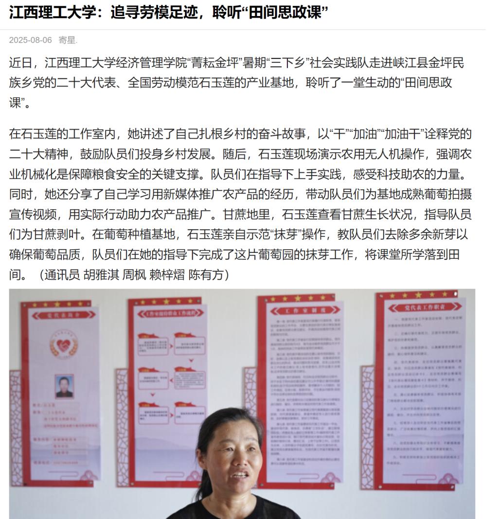 近日,江西理工大学经济管理学院“菁耘金坪”暑期“三下乡”社会实践队走进峡江县金坪民族乡党的二十大代表、全国劳动模范石玉莲的产业基地,聆听了一堂生动的“田间思政课”。