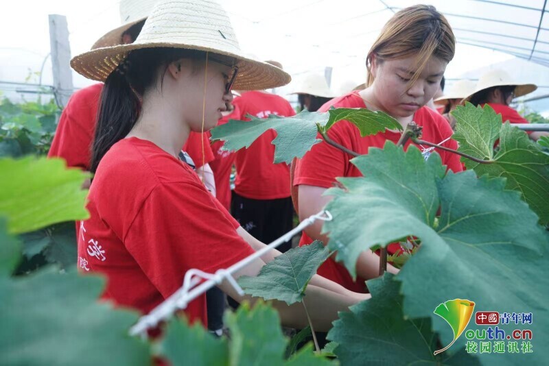随后,团队前往石玉莲产业基地。全国劳动模范石玉莲向队员们现场演示了农用无人机的操作流程,部分队员在其指导下尝试了上手操控。走进葡萄棚,石玉莲向队员们讲解葡萄“抹芽”的目的,教队员们去除多余新芽,并示范了该操作。队员们随后分组,在她的指导下完成了这片葡萄藤的“抹芽”工作,将课堂所学应用到田间。