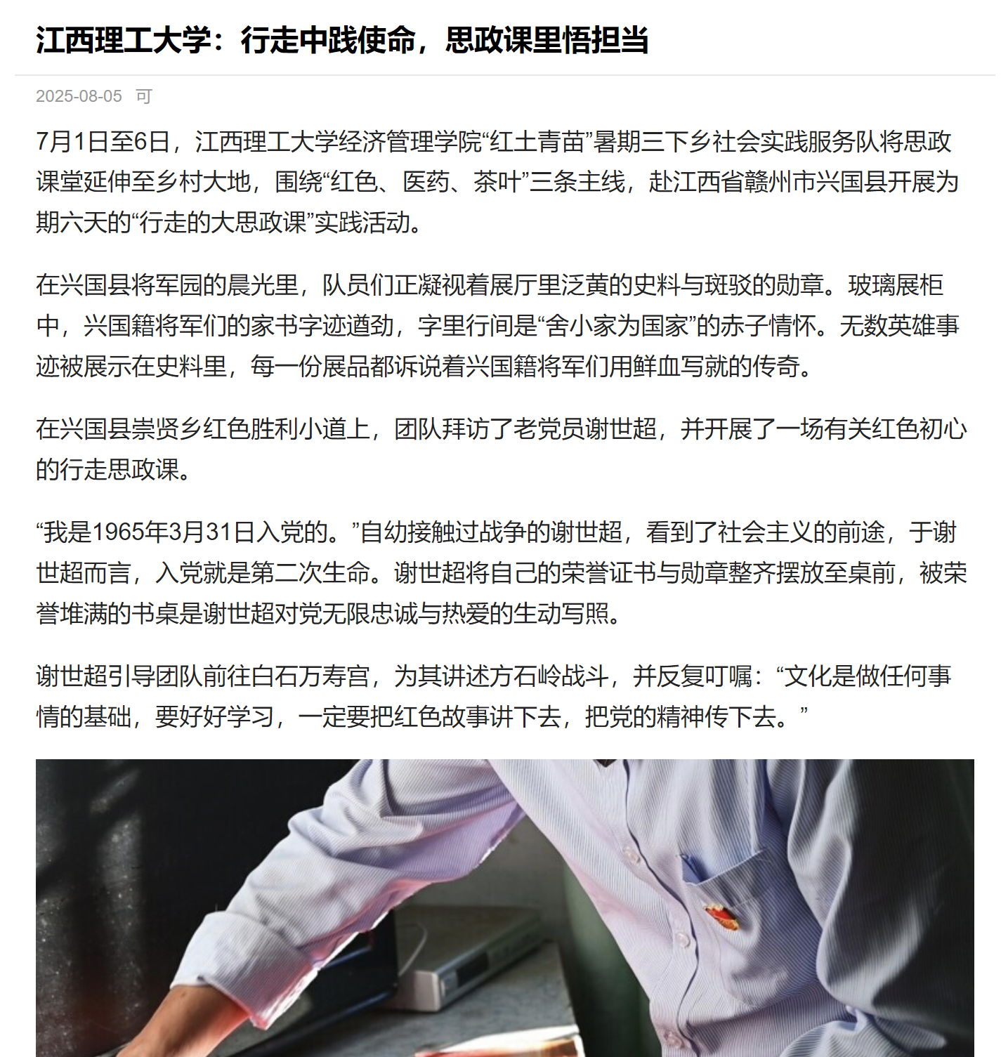 7月1日至6日,江西理工大学经济管理学院“红土青苗”暑期三下乡社会实践服务队将思政课堂延伸至乡村大地,围绕“红色、医药、茶叶”三条主线,赴江西省赣州市兴国县开展为期六天的“行走的大思政课”实践活动。