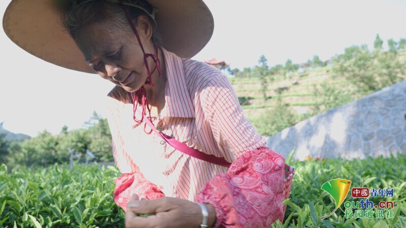 图为春赐福茶厂工人示范采茶。