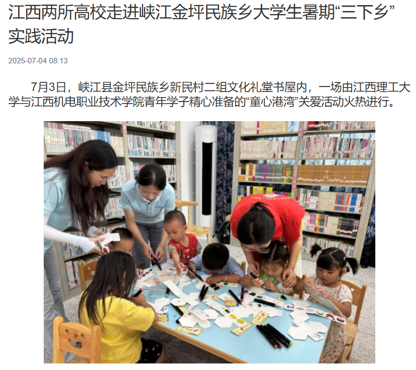 7月3日,峡江县金坪民族乡新民村二组文化礼堂书屋内,一场由江西理工大学与江西机电职业技术学院青年学子精心准备的“童心港湾”关爱活动火热进行。