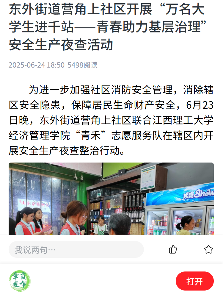 为进一步加强社区消防安全管理,消除辖区安全隐患,保障居民生命财产安全,6月23日晚,东外街道营角上社区联合江西理工大学经济管理学院“青禾”志愿服务队在辖区内开展安全生产夜查整治行动。