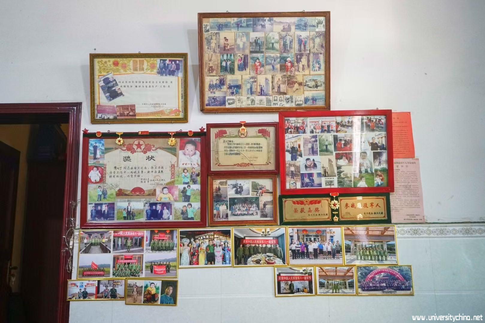 图为黄世宁家中挂满荣誉与照片的墙面。