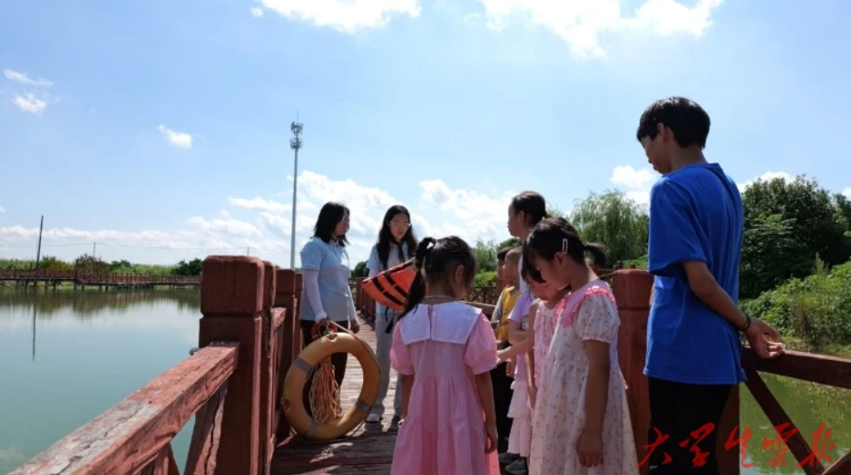 紧接着,课堂聚焦暑期安全防护。在河岸边,实践队员详细讲解防溺水要点,现场演示救生衣的正确穿戴与救生圈的使用方法,并分享防中暑的自救妙招,通过情景模拟引导孩子们反复操练。实践队员不时提出问题与孩子们互动,加深他们对安全知识的印象。