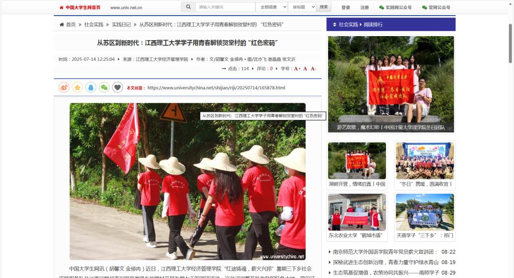 中国大学生网讯(胡馨文 金倬冉)近日,江西理工大学经济管理学院“红途铸魂,薪火兴邦”暑期三下乡社会实践服务队赴江西省赣州市兴国县崇贤乡贺堂村开展为期七天的调研活动。这片浸润着苏区血脉的红色土地,曾见证第三次“反围剿”方石岭战斗的硝烟,留存着白石万寿宫乡农协会讲习班的星火,却一度面临红色资源沉睡的困境。当青年学子踏上这片土地,一场跨越时空的解码行动悄然展开——他们以青春视角解读苏区精神的时代密码,用实践智慧激活红色资源的当代价值,在历史与现实的对话中,回答着“苏区精神如何照亮新时代”的命题。