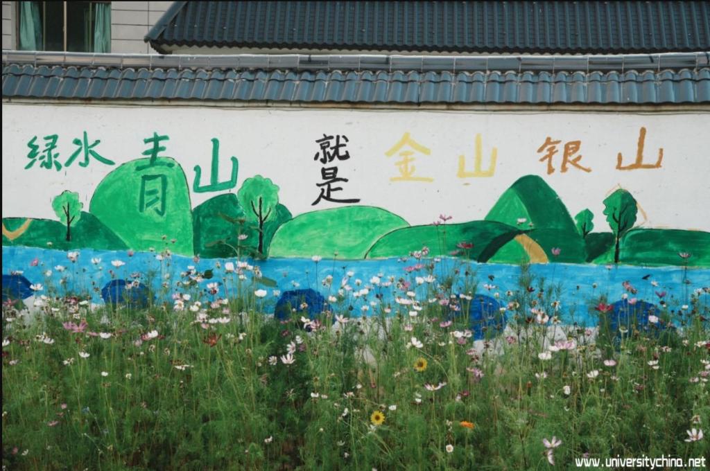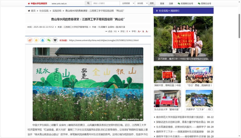 中国大学生网讯(胡馨文 金倬冉)赣南苏区的夏日,山风裹挟着茶香掠过贺堂村的白墙。近日,江西理工大学经济管理学院“红途铸魂,薪火兴邦”暑期三下乡社会实践服务队的队员们正俯身调色,让环保矿物颜料在墙面上晕染开“绿水青山就是金山银山”的字样,使笔触间流淌着青年对生态发展的思考。这场以墙为纸的创作,恰是学子们用青春实践诠释“两山论”的生动开篇。