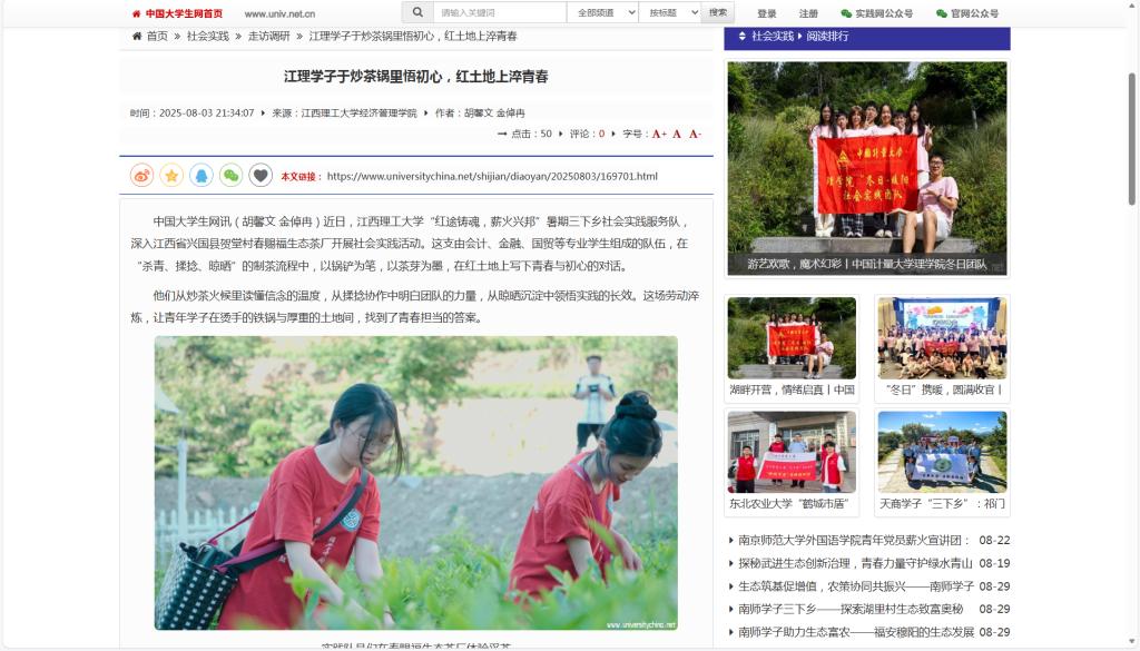 中国大学生网讯(胡馨文 金倬冉)近日,江西理工大学“红途铸魂,薪火兴邦”暑期三下乡社会实践服务队,深入江西省兴国县贺堂村春赐福生态茶厂开展社会实践活动。这支由会计、金融、国贸等专业学生组成的队伍,在“杀青、揉捻、晾晒”的制茶流程中,以锅铲为笔,以茶芽为墨,在红土地上写下青春与初心的对话。