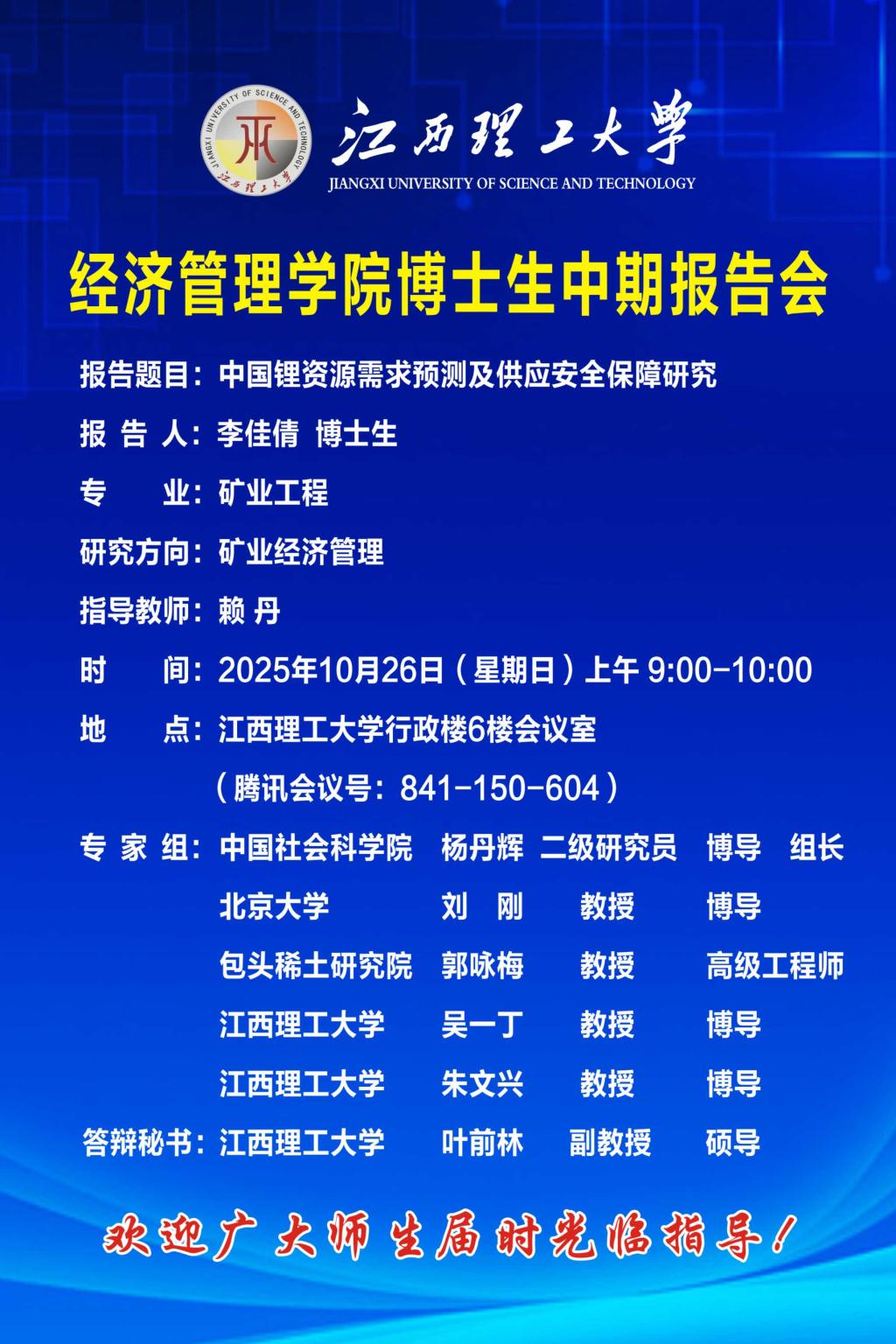 上一条:经济管理学院博士生中期报告会——《钕铁硼废料中镨钕元素的替代规模及替代效应研究》 下一条:江西理工大学经济管理学院2026年硕士研究生招生简章