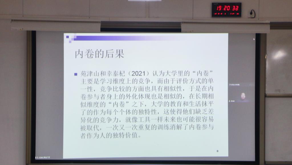 直播课上,费俊峰博士首先用“边骑车边敲代码”的图片及“清华王”等网络热传新闻导入话题,为我们阐释了内卷在教育领域的延伸概念。接着,他就内卷的具体表现、成因、影响为我们深度剖析了内卷的内涵性质。不仅如此,他向同学们表明——“不要输在起跑线上”、“我在培养你孩子的竞争对手”诸如此类的市场营销反映的是中国当下教育严重内卷化的社会大环境,在现实的压力下,内卷已经成为了大学生精神状态亚健康化的重要影响因素。
