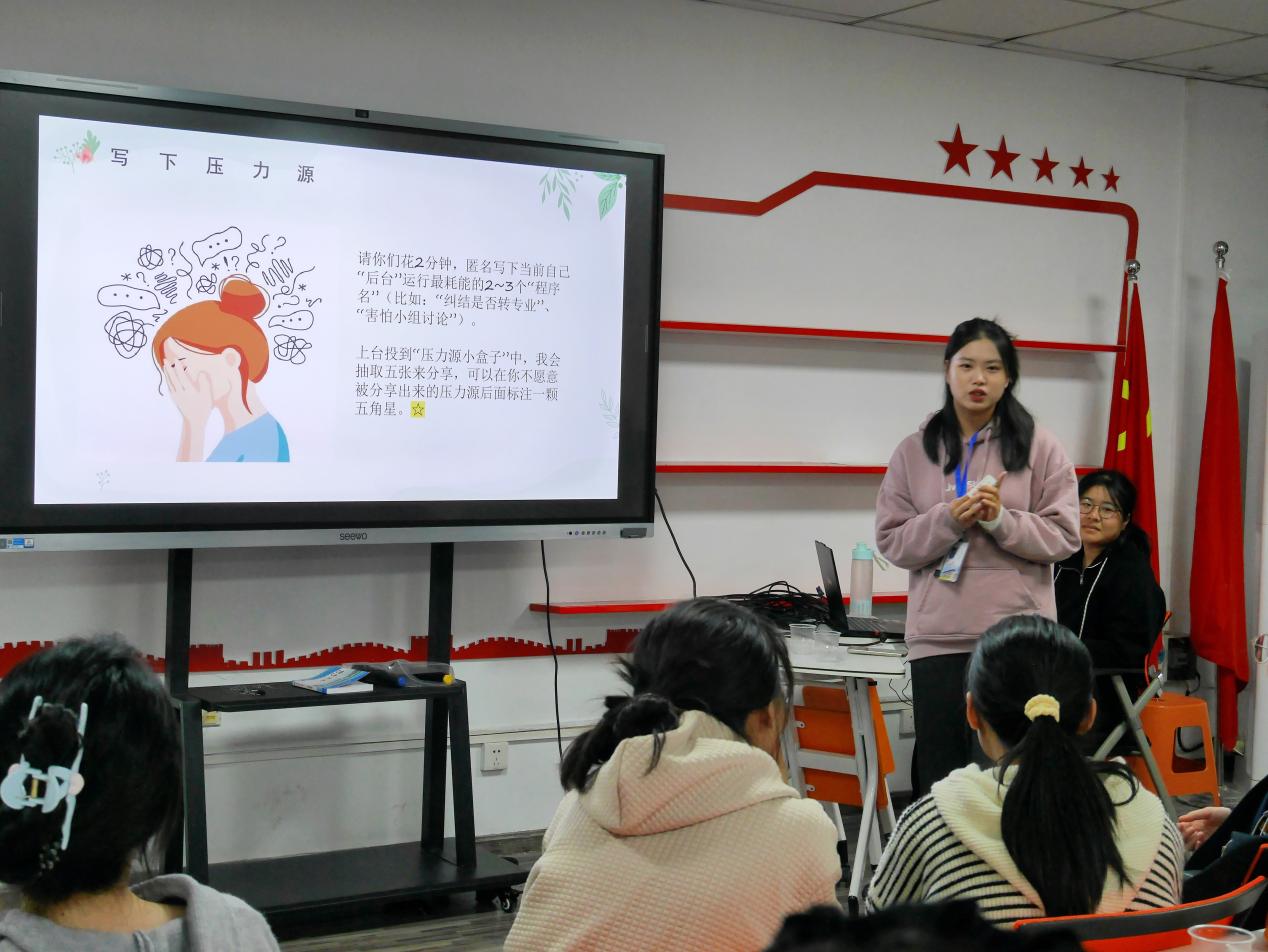 活动伊始,胡文婷结合PPT介绍了本次工坊的初衷与流程,并巧妙以“手机后台程序过载”为喻,生动揭示了当代大学生普遍面临的压力来源,引发在场同学深入思考。