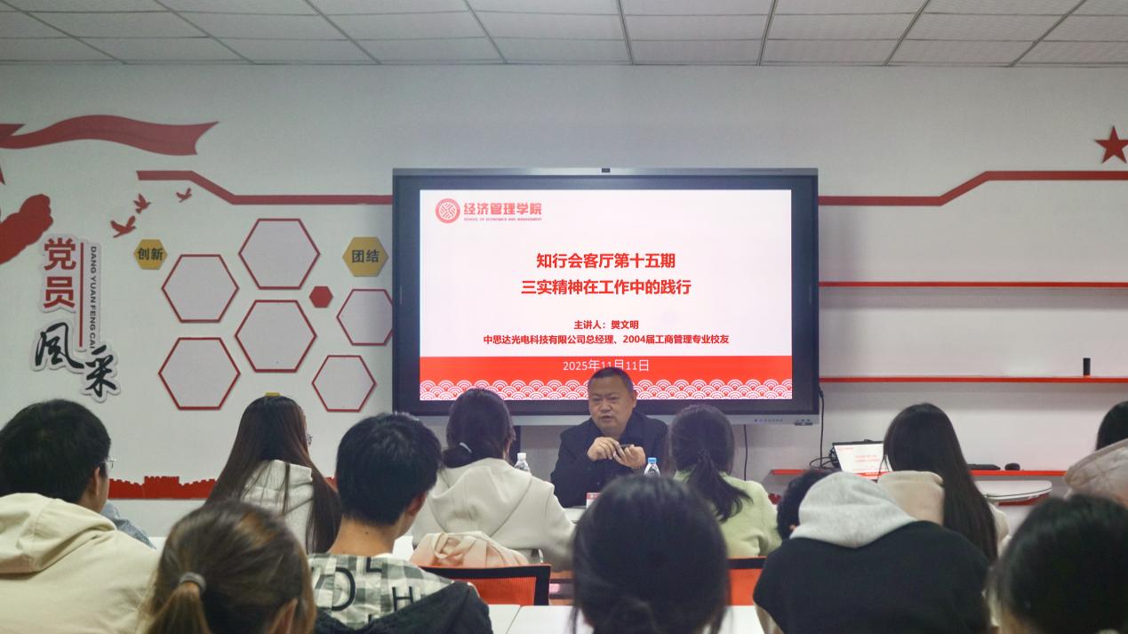 本网讯 为引导学子将“三实精神”融入职业发展,搭建理论与实践的沟通桥梁,11月11日,我院于红旗校区经管楼205活动室举办第15期知行会客厅。本期讲座以“三实精神在工作中的践行”为主题,由中思达光电科技有限公司总经理樊文明(2004届工商管理专业校友)主讲,会计学251班陈露主持,辅导员张海燕及学生代表参加。