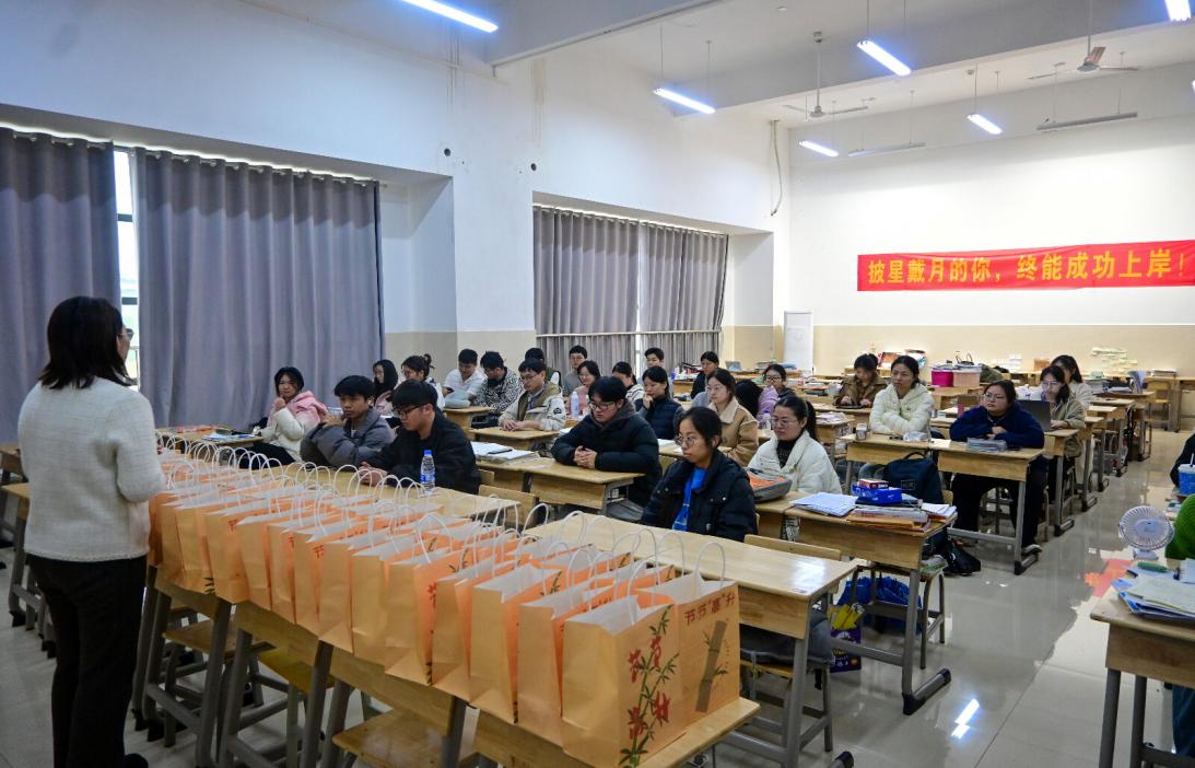 本网讯 为弘扬我院互帮互助优良传统、表达对考研学子的深切关怀,12月12日,我院于三江校区经世楼104考研自习室举行“一卷诗书酬壮志,满园桃李送温情”考研送温暖活动。我院党委副书记吴媛老师及毕业班辅导员、班主任老师为考研学子送上考研加油包。