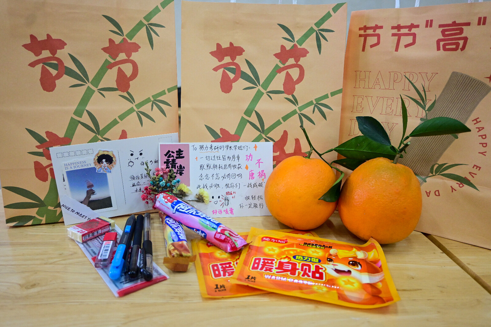 活动伊始,吴媛代表我院全体师生作考研慰问发言。她先肯定了考研学子长期以来的坚持与付出,赞扬大家在备考路上不畏艰辛、逐梦前行的拼搏精神,随后她为学子们送上“考研加油包”,鼓励大家调整心态、合理规划,以从容的姿态迎接挑战。加油包内,不仅有寓意着“脐开得胜”的脐橙、齐全的考研工具包以及各类暖心用品,还有学弟学妹们暖心的手写明信片,为学子们的“研途”注入满满能量。
