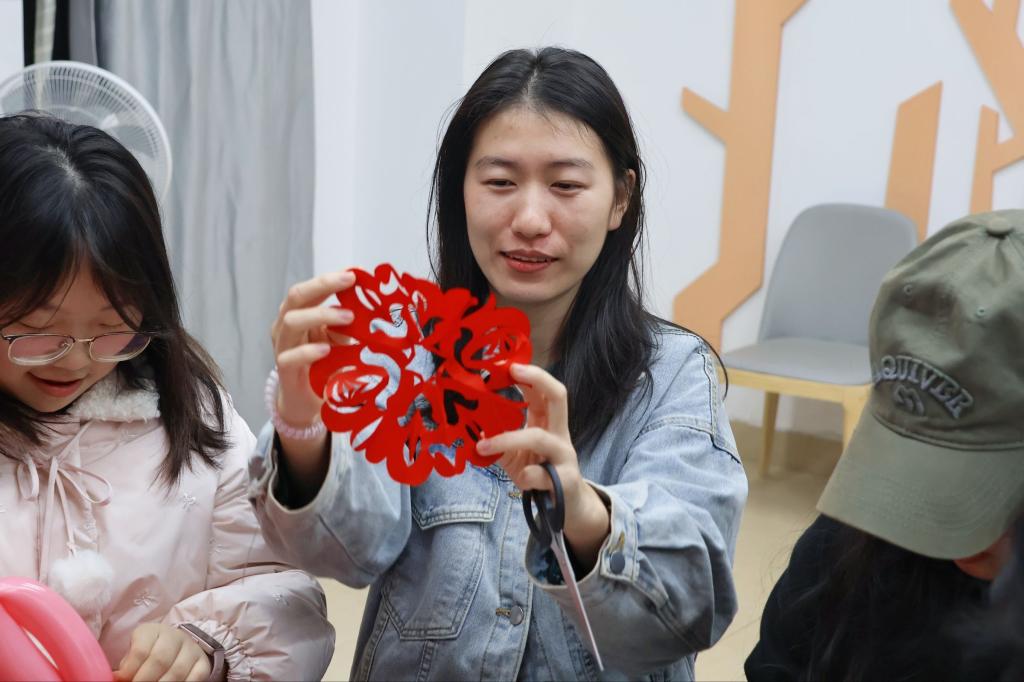 随后是年味非遗体验环节,红纸、毛笔、剪刀、红绳等材料整齐陈列,学子们或临摹字帖书写福字,或对照模板剪出生肖、雪花等吉祥窗花,或跟着教学编织平结、吉祥结等基础中国结,边分享手工心得边品尝零食,在传统技艺实践中感受浓厚年味与同伴温情。