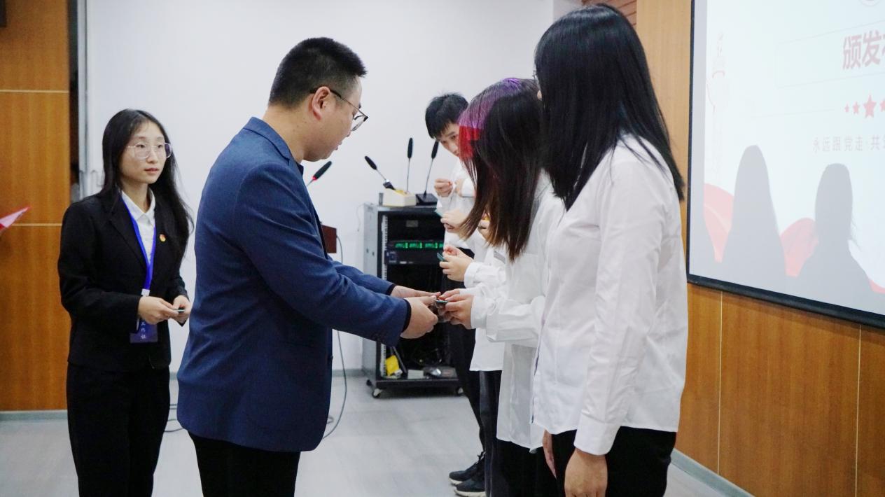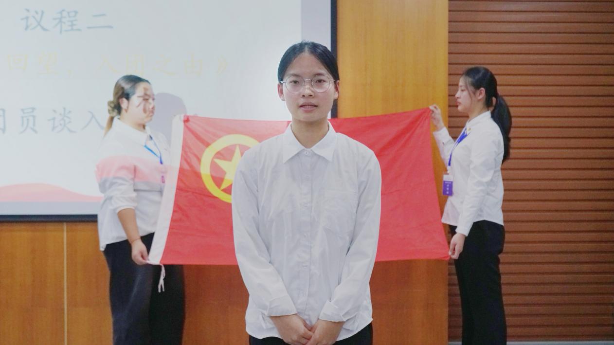 随着庄严的国歌奏响,仪式的序幕缓缓拉开。主持人宣布新团员名单后,张小松逐一为新团员代表颁发团徽和团员证。随后,优秀团员代表侯锐上台领誓,全体新团员面向团旗庄严宣誓,铿锵的誓言响彻会场。