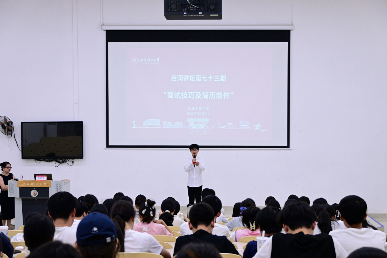 本网讯 为应对职场竞争,深入掌握就业核心技能,10月9日,学院于三江校区文山楼115教室举行第73期启润讲坛暨面试技巧及简历制作主题讲座,讲座由现任FLAMAGAS集团中国区人力资源经理赖丽蓉主讲,会计学241班傅书豪主持,学院22、23级学生代表参加。